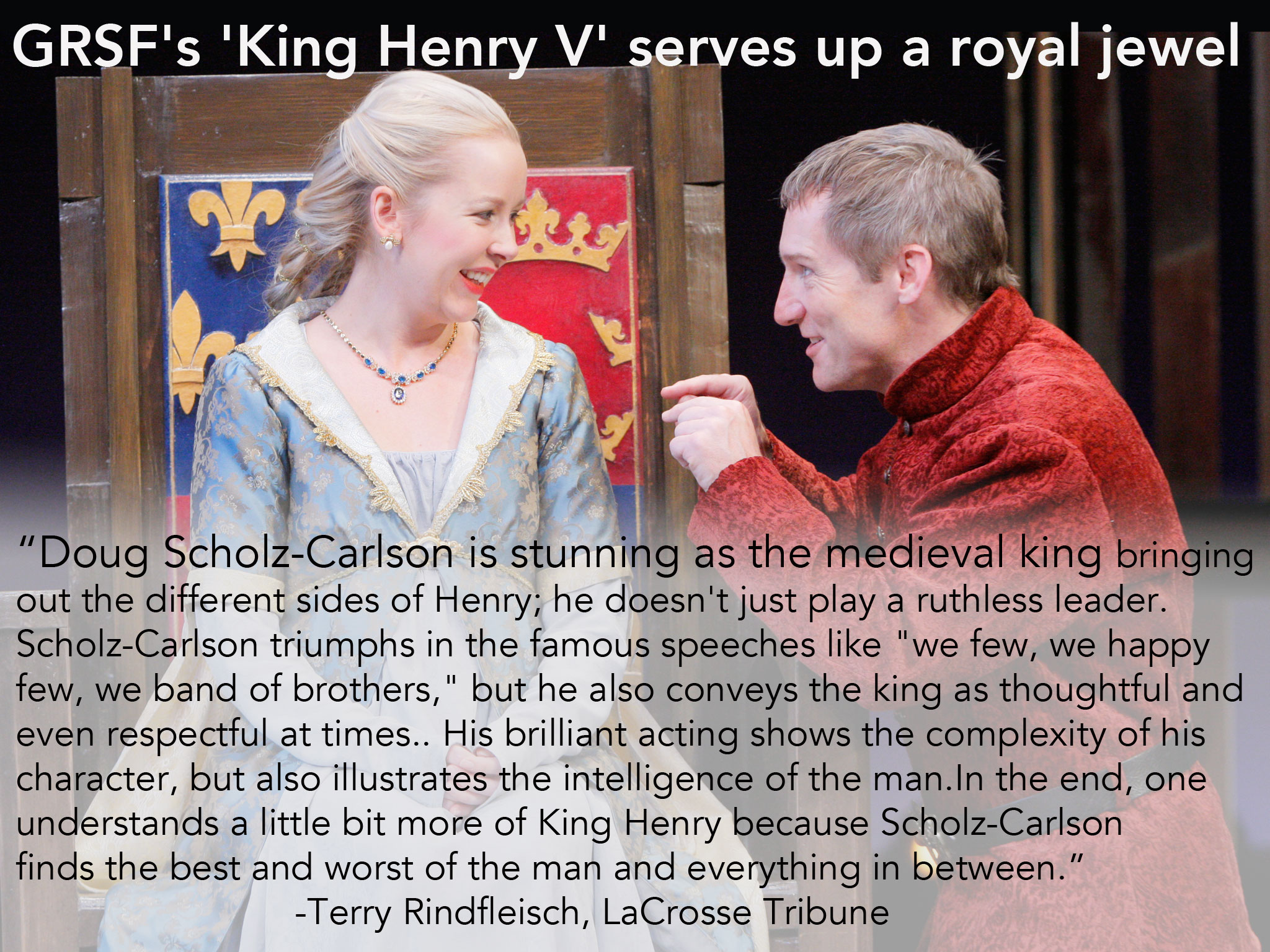 “This Henry consistently rings true when he tells he is ‘but a man.’ Buth that man must also be kind, and what’s most impressive about Scholz-Carlson’s performance is that even as he mingles with his men, he quietly retains the dignity and distance which is his privilege and his curse. We feel this Henry’s pain as he condemns his traitorous counselors to death, send the thieving Bardolph to the gallows or delivers his great soliloquy about the burden of power.”