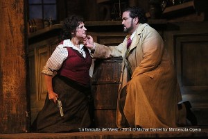 Claire Rutter as Minnie and Rafael Davila as Dick Johnson in the Minnesota Opera production of La fanciulla del West