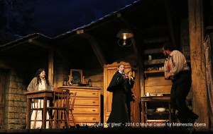 Claire Rutter as Minnie, Greer Grimsley as Jack Rance, and Rafael Davila as Dick Johnson in the Minnesota Opera production of La fanciulla del West