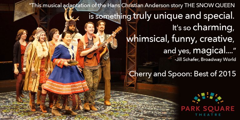 The Snow Queen at Park Square Theatre: following the delightful new trend of musicals in which cast and band are one, eight actor/musician/singer/dancers told Hans Christian Anderson’s charming winter tale with joyful innovation. It was a truly magical and spellbinding evening of storytelling.”