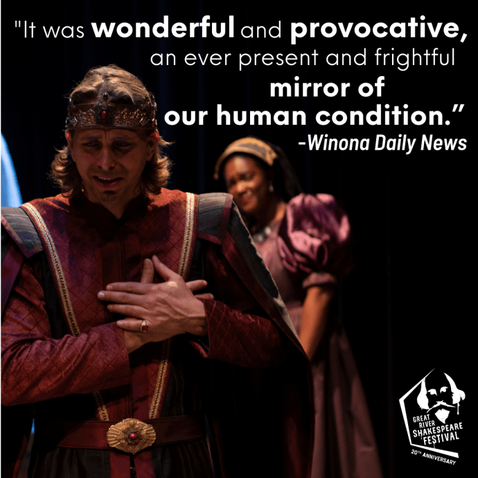 Director | The Winter’s Tale | Great River Shakespeare Festival June 3, 2023November 29, 2023 “It was wonderful and provocative, an ever present and frightful mirror of our human condition” Winona Daily News Share this: Click to share on Facebook (Opens in new window) Facebook Click to share on X (Opens in new window) X Like Loading... Posted by Doug Scholz-Carlson Categories DirectorTags Great River Shakespeare Festival