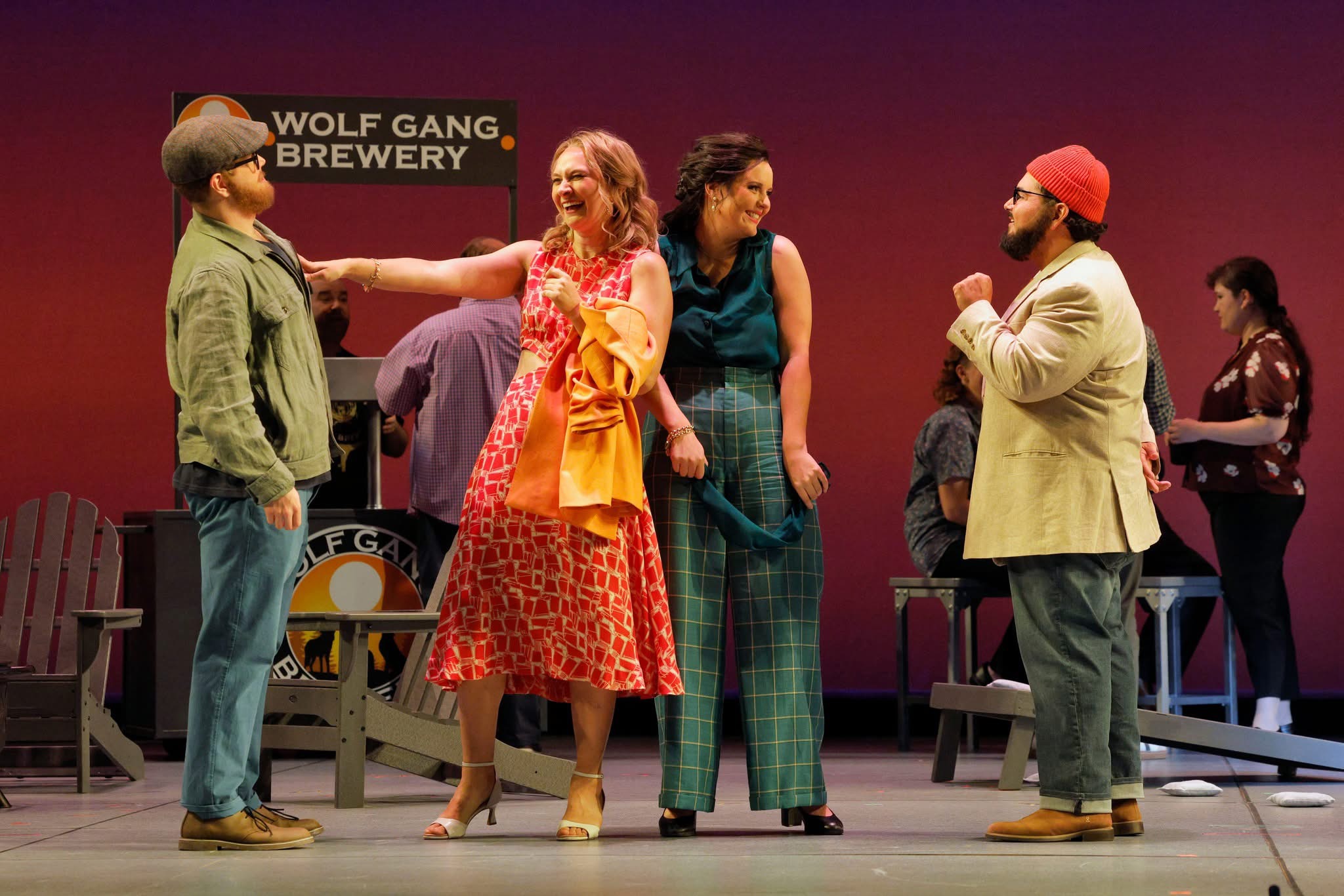 Stage director Scholz-Carlson has made a few changes that bring a buoyancy to the narrative to match that of the score. For one thing, the couples don’t necessarily reconcile. Instead, the audience decides, based on what we have seen up to the intermission.
