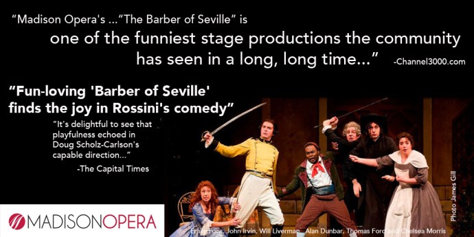 “Review: Fun-loving ‘Barber of Seville’ finds the joy in Rossini’s comedy” “Madison Opera’s lighthearted production of “The Barber of Seville” makes clear why this bright, comic opera has been endlessly adapted for cartoon characters… It’s delightful …